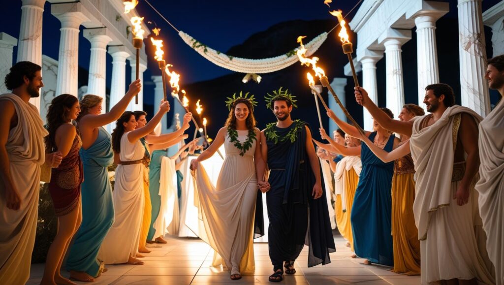 Olive branches, laurel wreaths, and invocations to Hera celebrated unity, victory, and protection. The lively procession balanced private intimacy with civic affirmation, showing that marriage strengthened the whole polis.